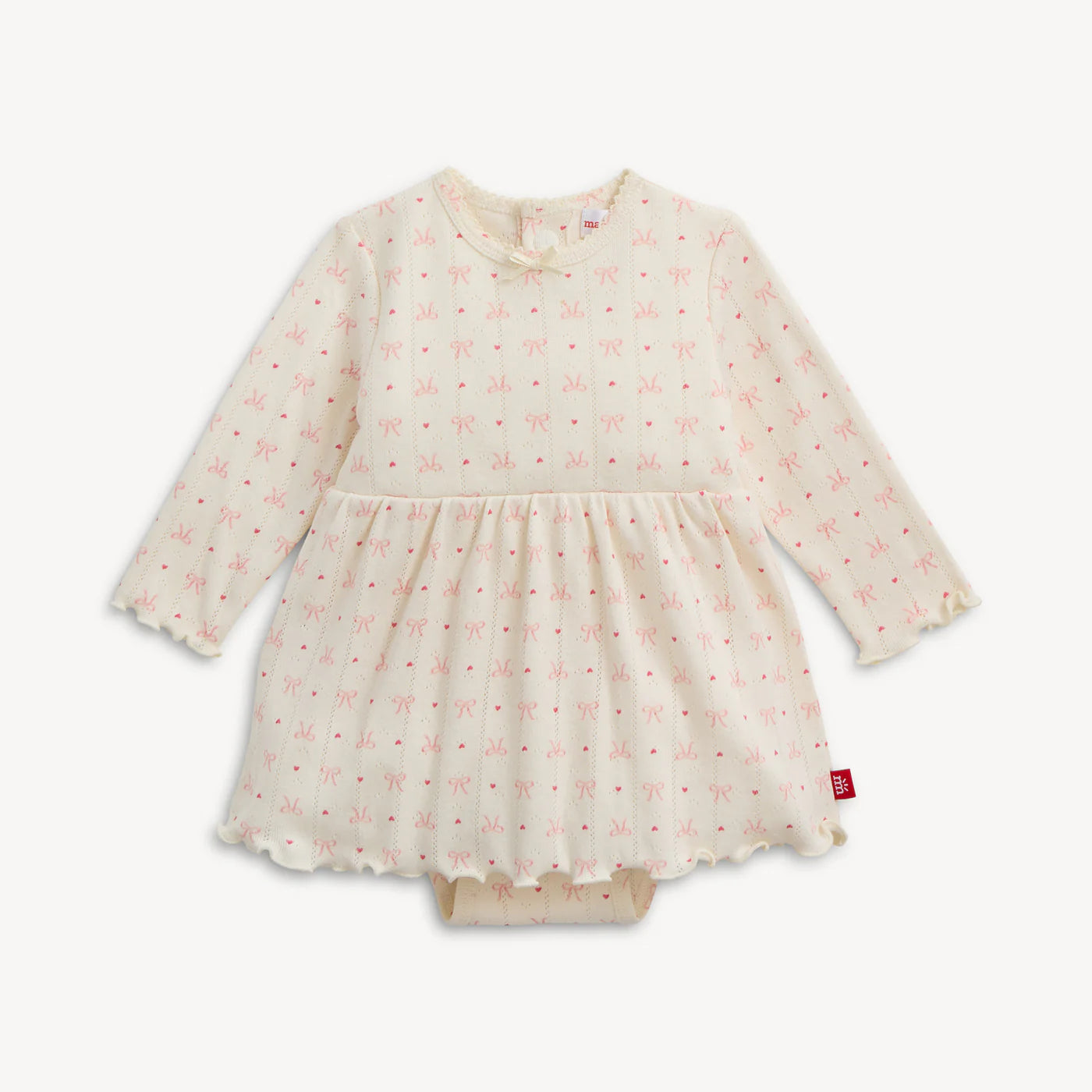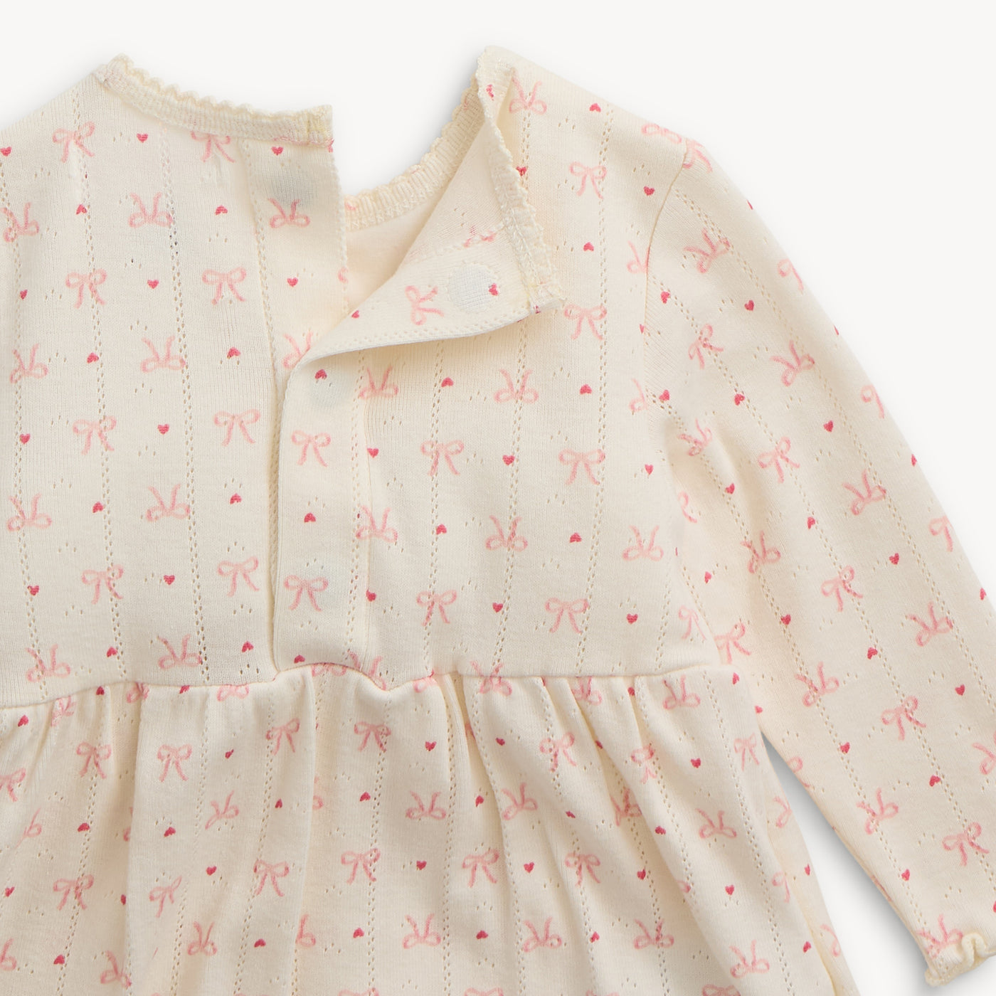Cute for parties, yet comfy (and washable) for the playground, our pointelle Bodysuit Dress is an easy solution to daytime dressing and on-the-go diaper changes. Magnets save time, while the neckline expands to ease over baby's head. Crafted in 100% organic cotton, it’s a soft and breathable style defined by sweet pointelle stitching.