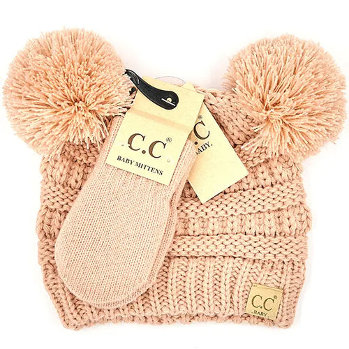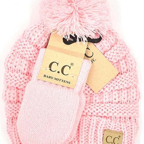C.C Baby Pale Pink Ribbed Pom Beanie and Mitten Glove