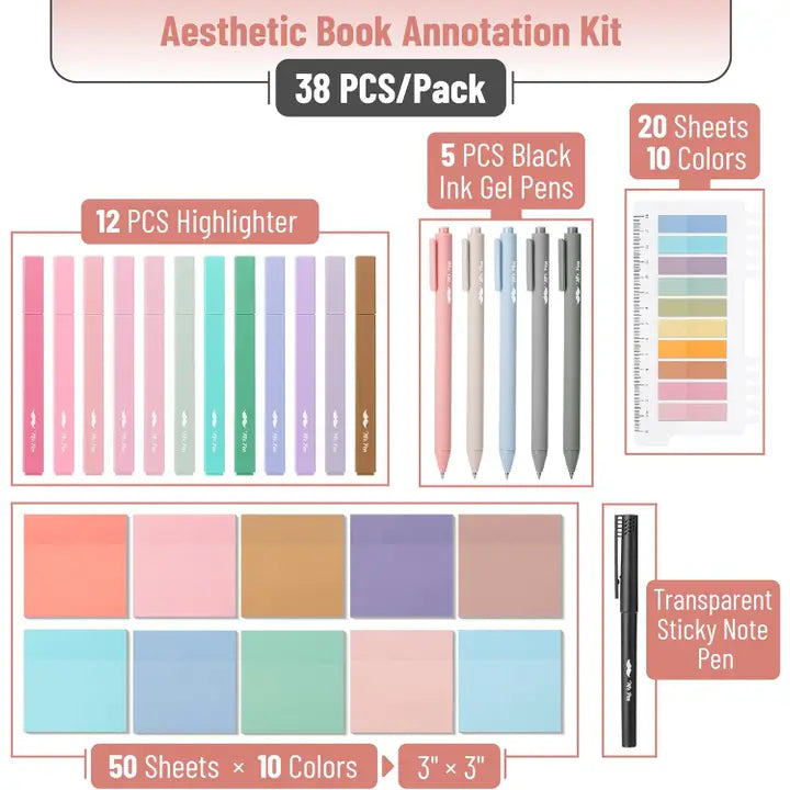 creative and organized note-taking, journaling, and book annotation. The kit features 12 pastel-colored highlighters, 5 black ink gel pens, and 1 fine-tip marker, perfect for highlighting, underlining, and making notes with precision. It also includes 10 different colors of 3" x 3" sticky notes, with 50 sheets per color, allowing you to add colorful annotations, reminders, and notes directly to your books or documents. Additionally, the kit comes with a set of 20 sticky tabs in 10 colors, ideal for marking pages, highlighting important sections, or creating a color-coded system for quick reference. This comprehensive annotation kit is perfect for students, professionals, and anyone who loves to read, study, or stay organized in style.